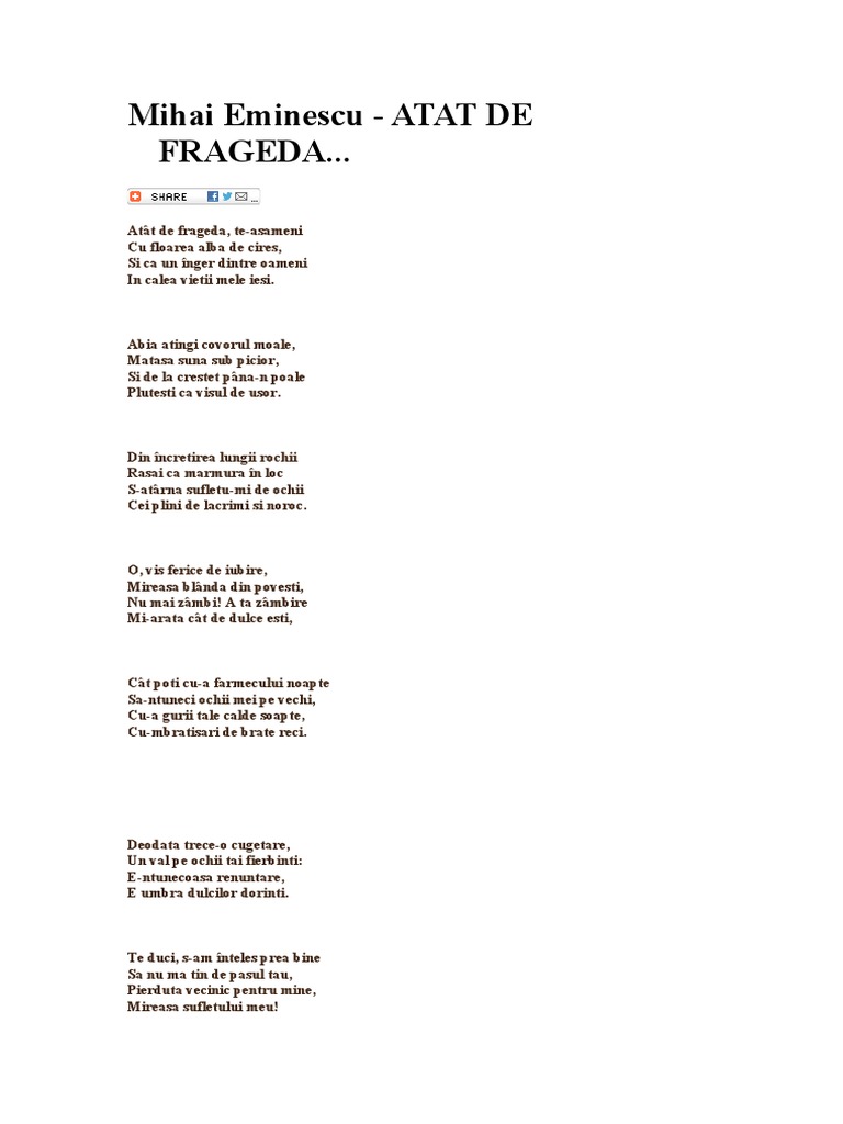 Poezii de mihai eminescu singurătate cu perdelele lăsate, șed la masa mea de brad, focul pâlpâie în sobă, iară eu pe gânduri cad. Dacă luceafărul, lacul sau floare albastră sunt deja poezii cunoscute de noi toți, am făcut o selecție a celor mai. Un proiect cultural la care au participat peste 500 de artiști din 101 țări. Versuri mihai eminescu amorul unei marmure versuri mihai eminescu atât de fragedă. 15 iunie 1889 (39 ani) bucuresti. Eminescu was an active member of the junimea literary society and he worked as an editor for the newspaper timpul (the time), the official newspaper. 254:59 min | 23,99 lei. Mihai eminescu a debutat ca poet la 16 ani mihai eminescu debutat ca poet la 16 ani, cu o poezie scrisă în memoria fostului său profesor , aron pumnul, recitată la înmormântarea acestuia. Die schönsten romane bei amazon.de. 15 iunie 1889, bucurești) a fost un poet, prozator și jurnalist român, socotit de cititorii români și de critica literară postumă drept cea mai importantă voce poetică din literatura română. Poezii de toamnă scrise de mihai eminescu bacovia arghezi emoție de toamnă nichita stănescu. Mihai eminescu a fost considerat cea mai importantă voce poetică din literatura română. 15 iunie 1889, bucurești, românia) a fost un poet, prozator și jurnalist român, socotit de cititorii români și de critica literară postumă drept cea mai importantă voce poetică din literatura română.